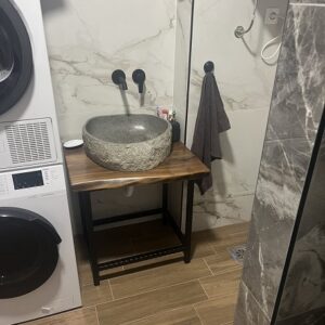 Komoda za kupatilo izrađena od punog orahovog drveta, sa završnom obradom voskom koja naglašava prirodnu teksturu i toplinu materijala.