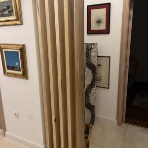 Svaka lamela dimenzija 55 × 4 cm proteže se do visine od 270 cm, stvarajući ritam koji deli prostor bez potpunog zatvaranja. Površina je tretirana mat poliuretanskim lakom koji naglašava prirodnu teksturu drveta i štiti ga zadržavajući diskretnu, nereflektujuću završnicu.