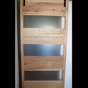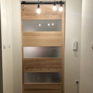 Klizna vrata izrađena od punog jasena, sa umetnutim staklenim površinama. Konstrukcija je prilagođena otvoru visine 260 cm i širine 130 cm, sa završnom obradom u matnom poliuretanskom laku koji naglašava prirodnu teksturu drveta.