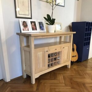 Komoda izrađena od punog jasena, sa dimenzijama 120 × 50 cm i visinom od 85 cm. Površina je tretirana poliuretanskim lakom u mat završnici, što naglašava prirodnu teksturu drveta i obezbeđuje trajnost u svakodnevnoj upotrebi.