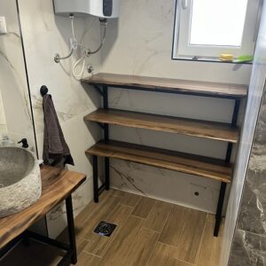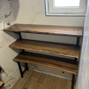 Polica od hrastovog drveta sa ulivenom epoxy smolom, izrađena po meri za konkretnu prostornu potrebu.