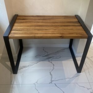 Konstrukcija počiva na metalnim nogarama od pravougaonog profila 80 × 30 mm, završenim crnim mat premazom 3u1. Proporcionalna ravnoteža između masivne ploče i čvrste metalne osnove definiše karakter ovog komada nameštaja.
