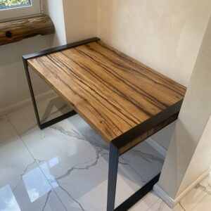 Radni sto izrađen od hrastovine i epoxy smole, sa metalnim nogarama u crnoj mat završnoj obradi.