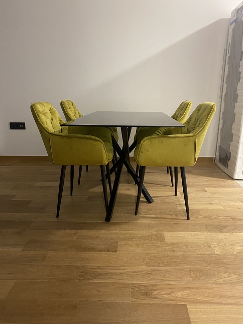 Konstrukciju čine metalne nogare od kvadratnog profila 40 × 40 mm, završene mat crnim premazom 3u1. Proporcije između dimenzija ploče i debljine profila obezbeđuju vizuelnu ravnotežu – konstrukcija nosi površinu bez vizuelne težine, a metal ostaje dovoljno prisutan da definiše karakter komada.