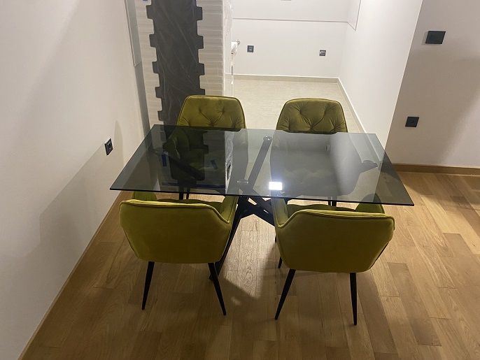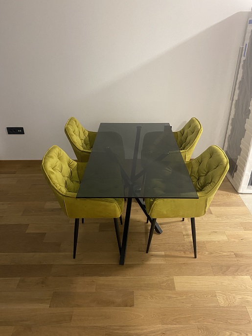 Trpezarijski sto sa pločom od kaljenog stakla i metalnim nogama, izrađen po meri za konkretnog klijenta. Ploča debljine 10 mm proteže se na dimenzijama 150 × 80 cm, dok je visina stola 75 cm. Staklo je kaljeno, što obezbeđuje potrebnu otpornost za svakodnevnu upotrebu.