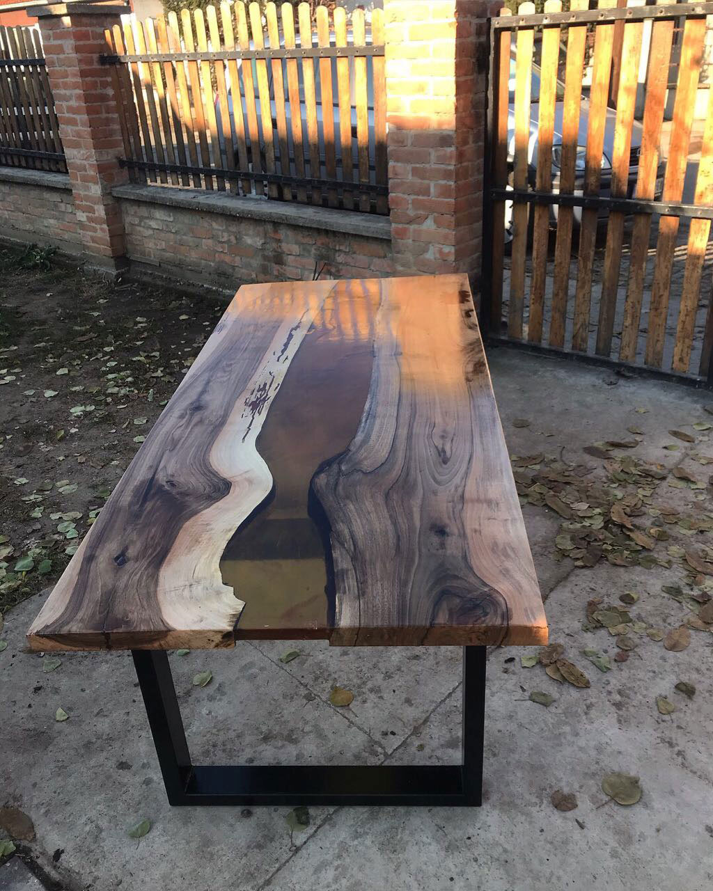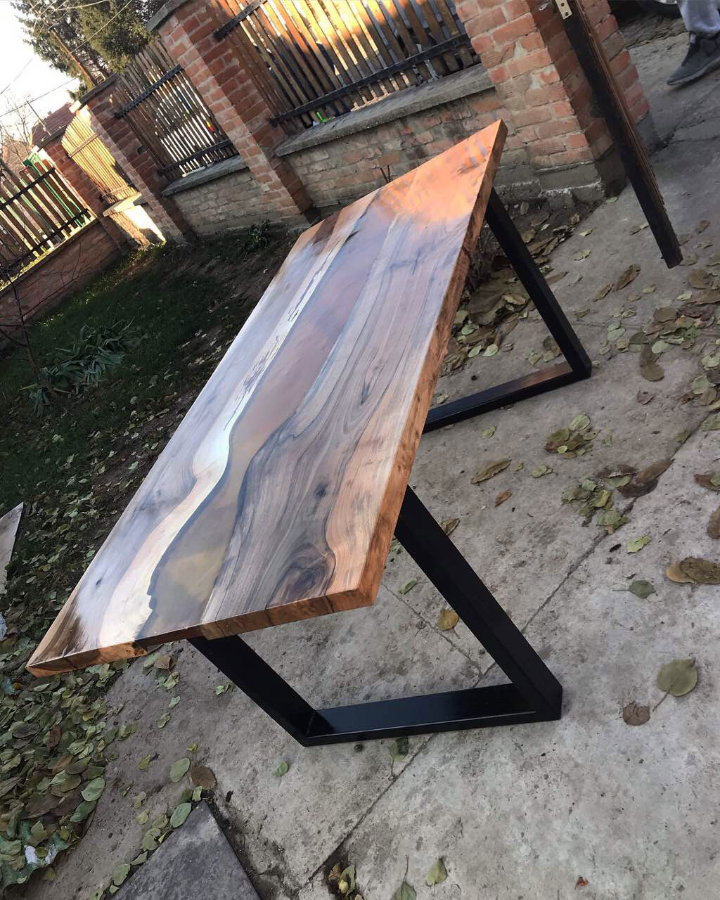 Trpezarijski sto izrađen od orahovine i epoxy smole, sa metalnim nogarama u crnoj mat završnici.