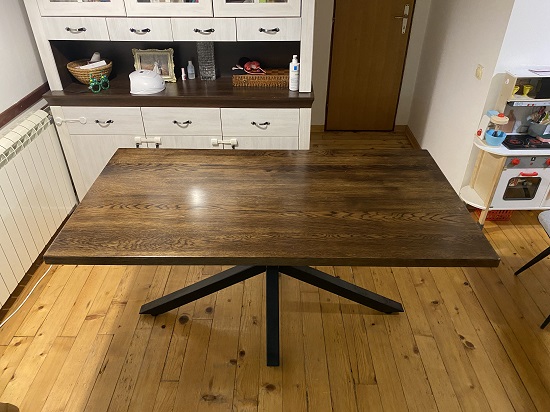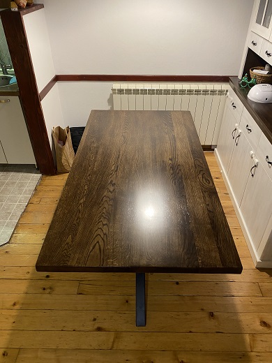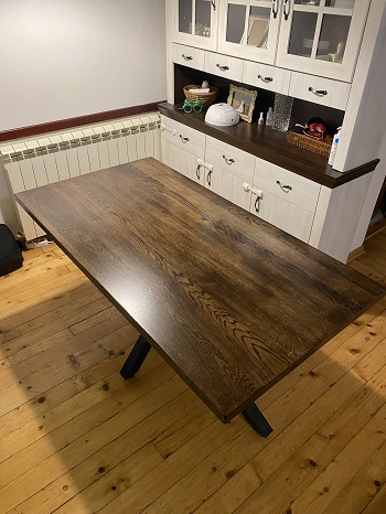 Trpezarijski sto izrađen od hrastovog drveta sa metalnom podkonstrukcijom. Ploča je obrađena u bajc tehnici i zaštićena mat poliuretanskim lakom.