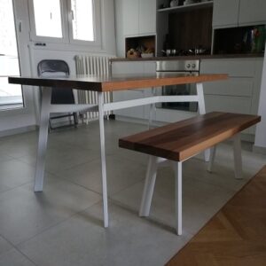 Odnos masivne drvene ploče i geometrijske čelične konstrukcije uspostavlja ravnotežu između toplih i hladnih tonova. Ovo je primer prethodne izrade, realizovan po meri klijenta.