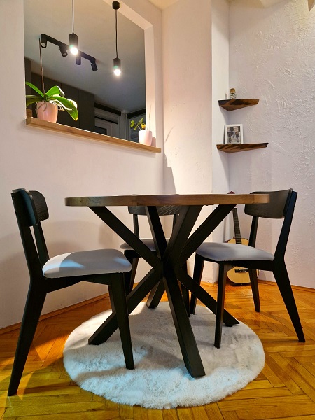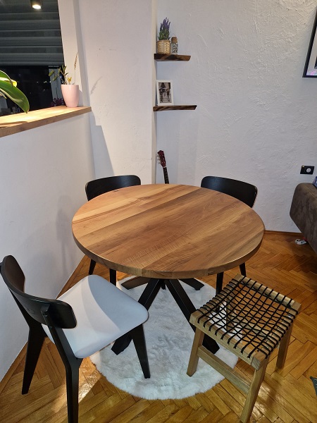 Prečnik ploče iznosi 110 cm, sa debljinom od 4 cm koja joj daje prisutnu, ali ne i tešku vizuru. Površina drveta zaštićena je mat poliuretanskim lakom koji zadržava prirodan izgled materijala. Nogare su tretirane mat crnim premazom 3u1, sa standardnom visinom stola od 75 cm.