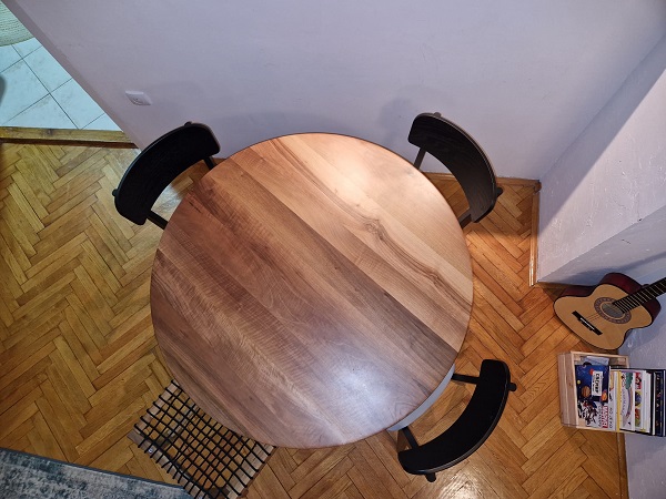 Okrugla ploča od parenog oraha postavljena je na konstrukciju od četiri metalne nogare, oblikovane od kvadratnih profila dimenzija 60 × 60 mm.