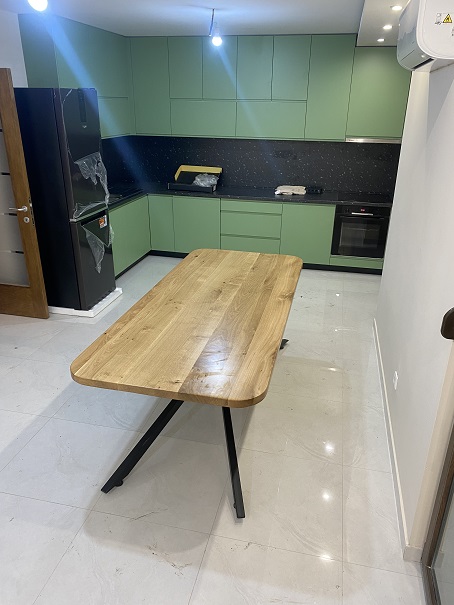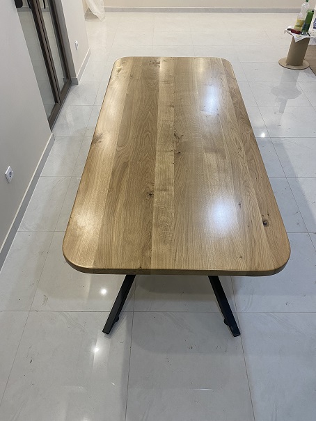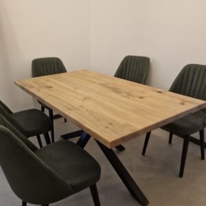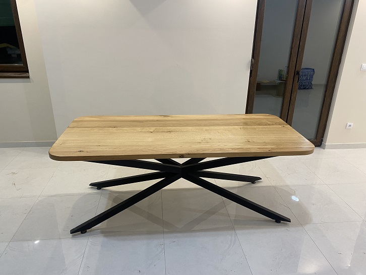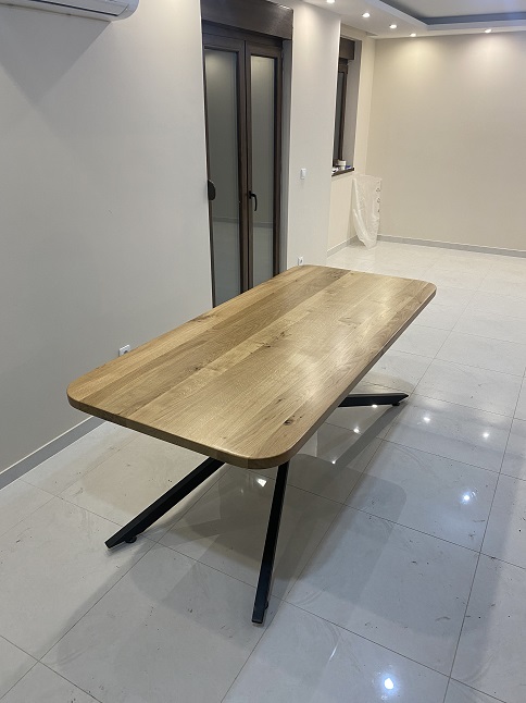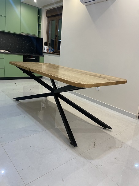 Konstrukcija počiva na metalnim nogarama profila 60 × 40 mm, završenim crnim mat premazom 3u1. Odnos masivne hrastove površine i čeličnog postolja formira vizuelnu ravnotežu između toplih i hladnih tonova, između organskog i industrijskog.