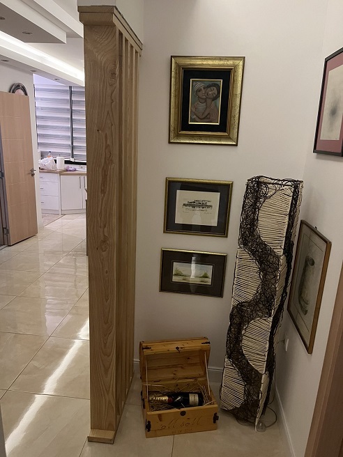 Svaka daska dimenzija 200×14×4 cm postavljena je sa ravnomernim razmakom, omogućavajući vizuelnu propusnost uz jasno definisanu granicu. Ukupna širina pregrade iznosi 60 cm, dok visina od dva metra prati standardne arhitektonske proporcije enterijera. Površina je završena mat poliuretanskim lakom koji naglašava prirodnu teksturu jasena bez dodavanja sjaja.