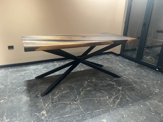Trpezarijski sto izrađen od parenog oraha i epoxy smole, sa metalnom konstrukcijom. Ploča dimenzija 250×110 cm debljine 8 cm kombinuje prirodnu teksturu drveta sa transparentnom smolom, dok je završni premaz izveden u istom materijalu koji naglašava kontinuitet površine.