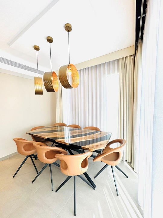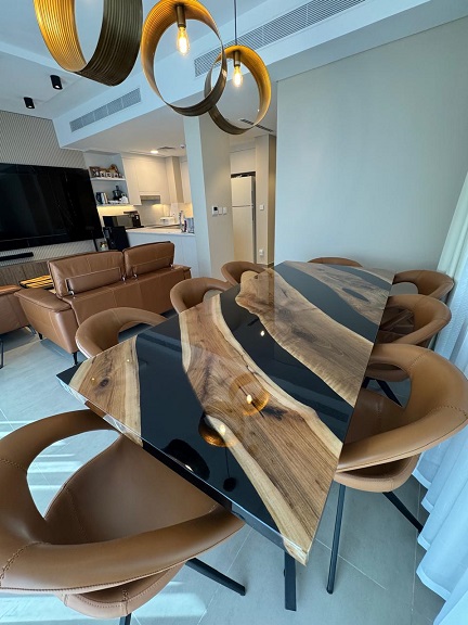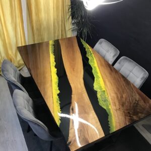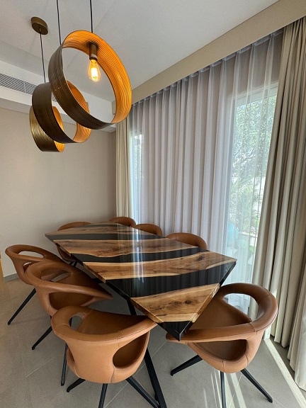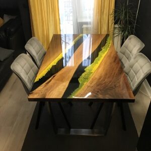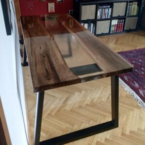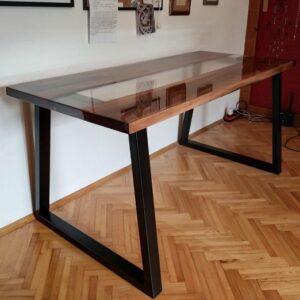 Trpezarijski sto izrađen od masivnog oraha i epoxy smole, postavljen na metalnu konstrukciju. Ploča dimenzija 250 × 110 cm nosi prirodan crtež drveta uz transparentnu smolu koja ispunjava prostor između dasaka. Završni premaz epoxy smolom štiti površinu i naglašava teksturu materijala. Visina stola je 75 cm.