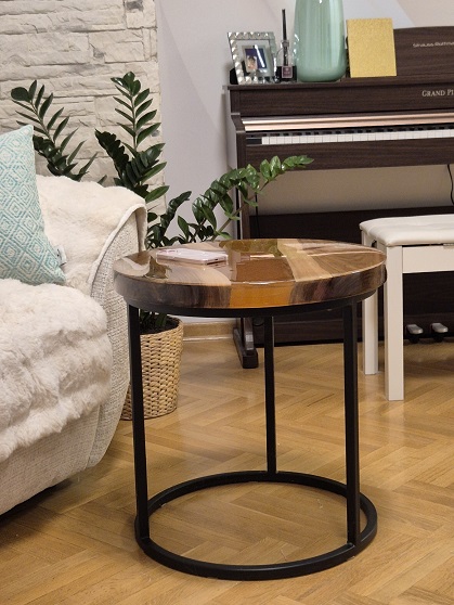 Ploče debljine 4 cm oblikovane su u kružnom formatu – prvi prečnika 55 cm sa visinom od 50 cm, drugi prečnika 50 cm i visine 43 cm. Površina oraha zalivena je epoxy smolom koja naglašava prirodan crtež drveta i obezbeđuje trajnu zaštitu.