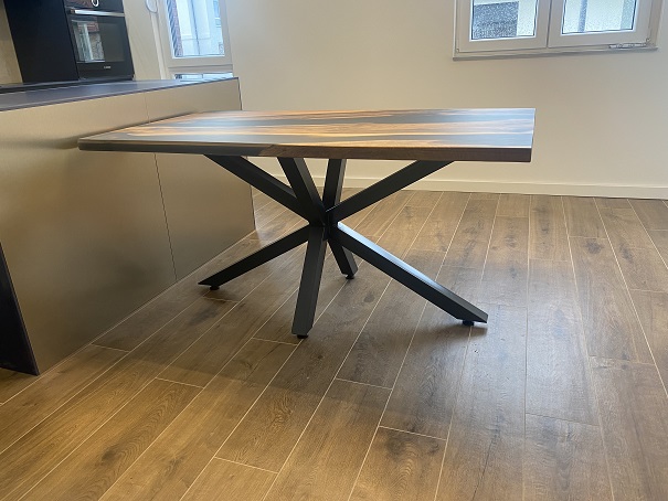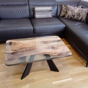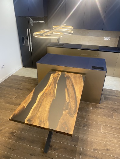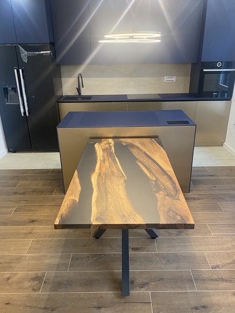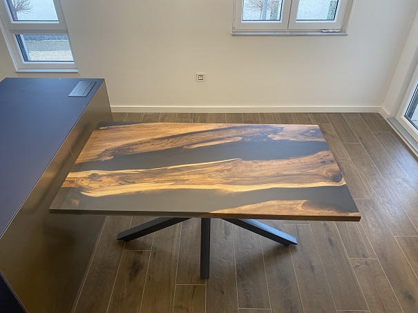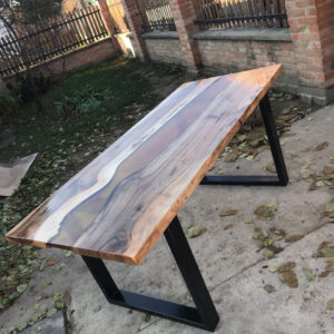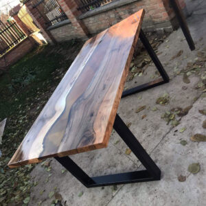 Trpezarijski sto izrađen od orahovine i epoxy smole, sa metalnom konstrukcijom. Ploča dimenzija 150×80 cm, debljine 4 cm, završena je slojem epoxy smole koja naglašava prirodnu teksturu drveta i štiti površinu.