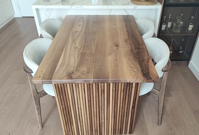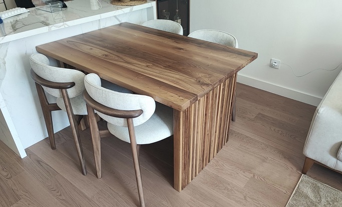 Trpezarijski sto od parenog oraha, izrađen sa mogućnošću proširenja pomoću nastavka. Ploča debljine 4 cm zaštićena je mat poliuretanskim lakom koji naglašava prirodnu teksturu drveta.
