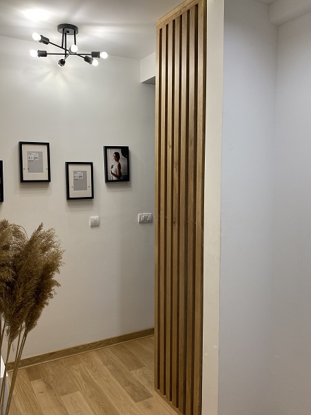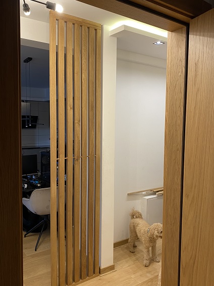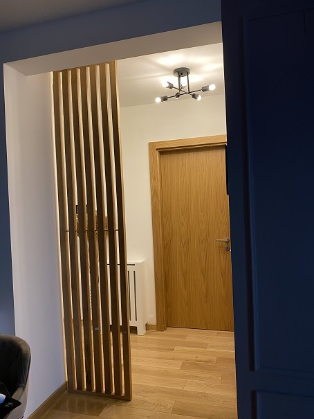 Svaka lamela dimenzija 55 × 4 cm proteže se do visine od 270 cm, stvarajući ritam koji deli prostor bez potpunog zatvaranja. Površina je tretirana mat poliuretanskim lakom koji naglašava prirodnu teksturu drveta i štiti ga zadržavajući diskretnu, nereflektujuću završnicu.