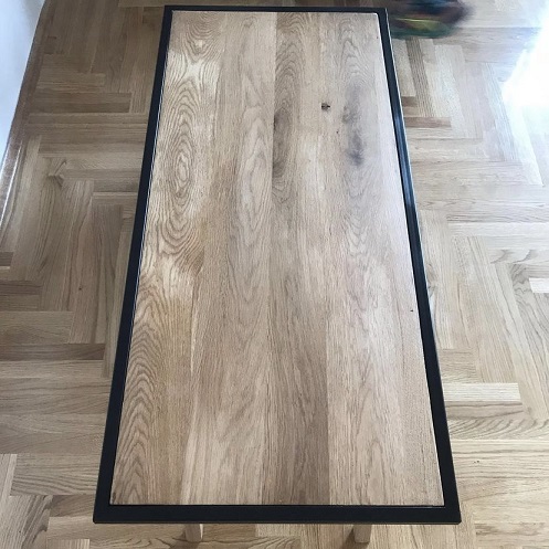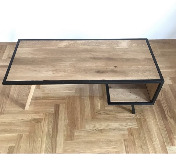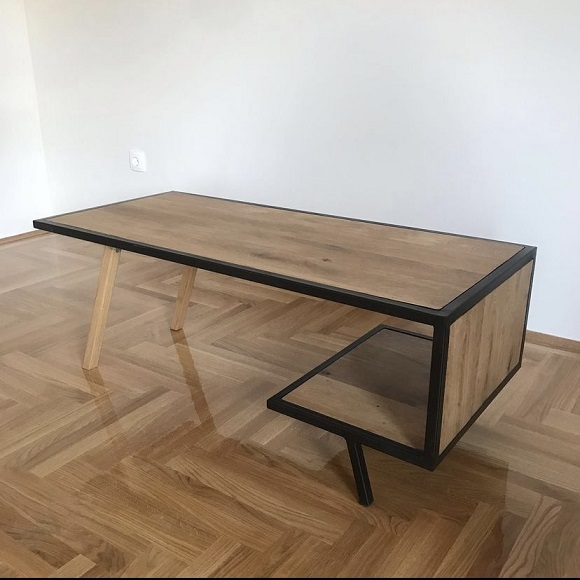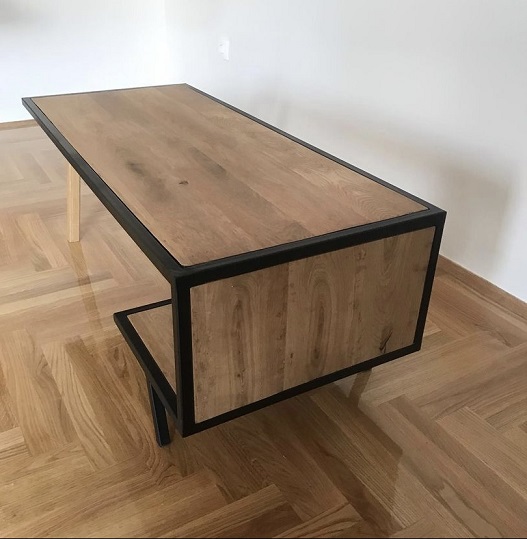Konstrukcija počiva na metalnom ramu formiranom od cevi profila 20 × 20 mm, završenom mat crnim premazom. Odnos tanke metalne strukture i pune drvene ploče stvara vizuelnu ravnotežu između lakoće i stabilnosti.