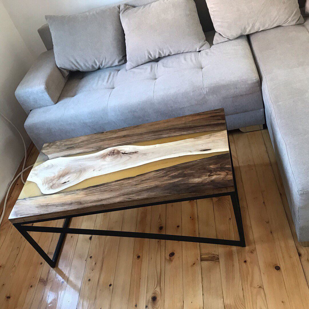 Klub sto izrađen od punog oraha i providne epoxy smole, sa metalnom podkonstrukcijom.