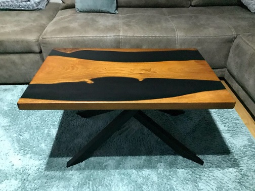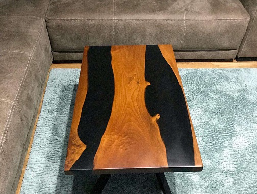 Klub sto izrađen od parenog oraha sa epoxy smolom, postavljen na metalne nogare crne mat završne obrade.
