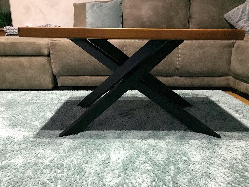 Konstrukcija počiva na metalnim nogarama od cevi profila 50 × 30 mm, završenim crnim mat premazom 3u1. Kontrast između organskog karaktera ploče i industrijske čvrstine metalnog postolja definiše vizuelni identitet komada.