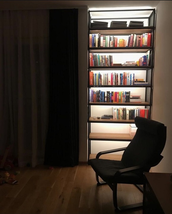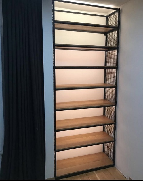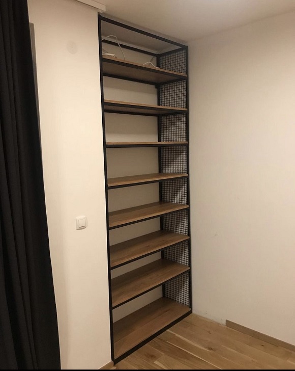 Metalna polica za knjige realizovana je u kombinaciji hrastovog drveta i čelične konstrukcije, osmišljena kao vertikalno rešenje za prostor dimenzija 110 × 40 cm i visine 270 cm.