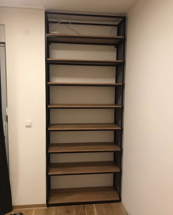 Hrastove police debljine 2 cm završene su poliuretanskim lakom u sjajnom premazu, što naglašava prirodnu teksturu drveta i obezbeđuje trajnu zaštitu površine. Metalna konstrukcija izvedena je od čeličnih cevi profila 20 × 20 mm, završenih mat crnim premazom 3u1, čime se postiže vizuelna čvrstina i uravnoteženost celokupne strukture.