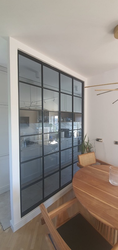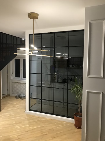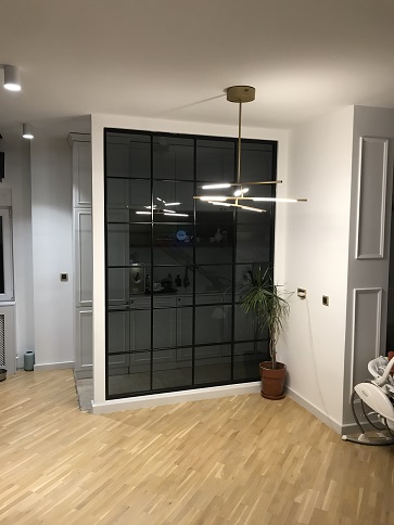 Pregradni zid izveden je kao kombinacija kaljenog stakla i metalne konstrukcije, oblikovan prema specifičnim prostornim zahtevima enterijera.