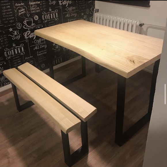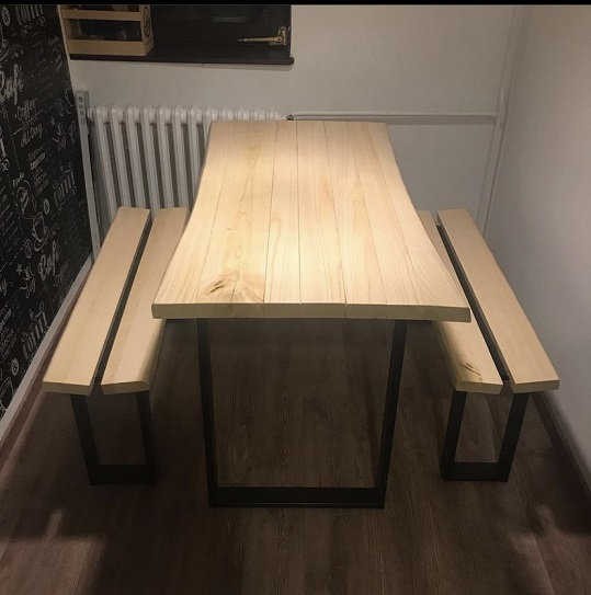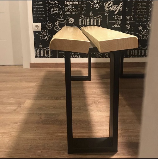 Konstrukcija počiva na metalnim nogarama od pravougaonih cevi profila 50 × 20 mm, završenih mat crnim premazom 3u1. Visina stola od 75 cm obezbeđuje standardne proporcije za trpezarijski prostor. Uz sto je izrađena i klupa dimenzija 100 × 27 cm, visine 45 cm, koja prati isti materijalizacioni i vizuelni jezik.