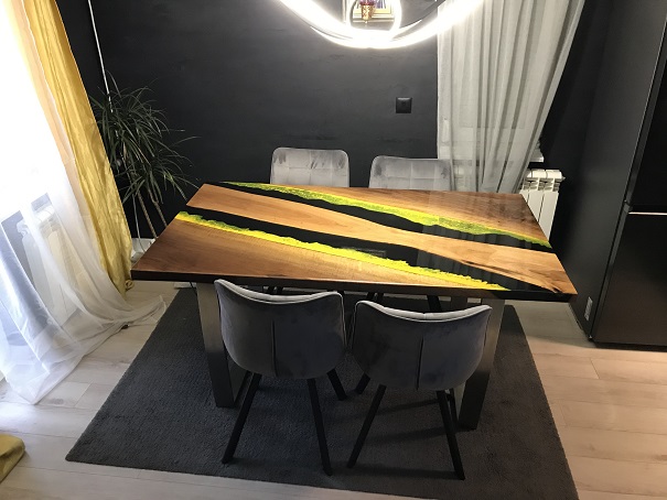 Trpezarijski sto izrađen od parenog oraha i epoxy smole, sa dimenzijama 150 × 90 cm i visinom od 75 cm. Ploča debljine 4 cm formirana je od dva dela masivnog drveta između kojih se prostire prozirna smola, prateći prirodan oblik ivica. Završni premaz epoxy smolom objedinjuje površinu i naglašava teksturu drveta.