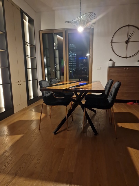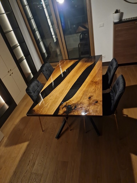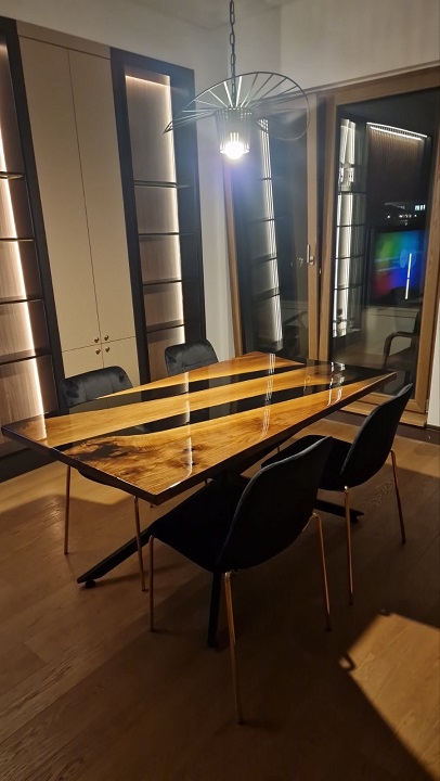 Trpezarijski sto izrađen od parenog oraha i epoxy smole, postavljen na metalnu konstrukciju crne mat završne obrade.