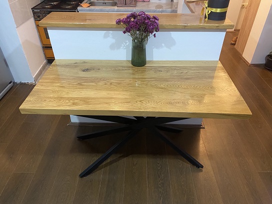Trpezarijski sto od punog hrasta sa metalnim nogarama, izrađen po meri za stambeni prostor. Ploča dimenzija 140 × 70 cm, debljine 4 cm, završena poliuretanskim lakom u sjaju koji naglašava prirodnu teksturu drveta. Visina stola je 75 cm.